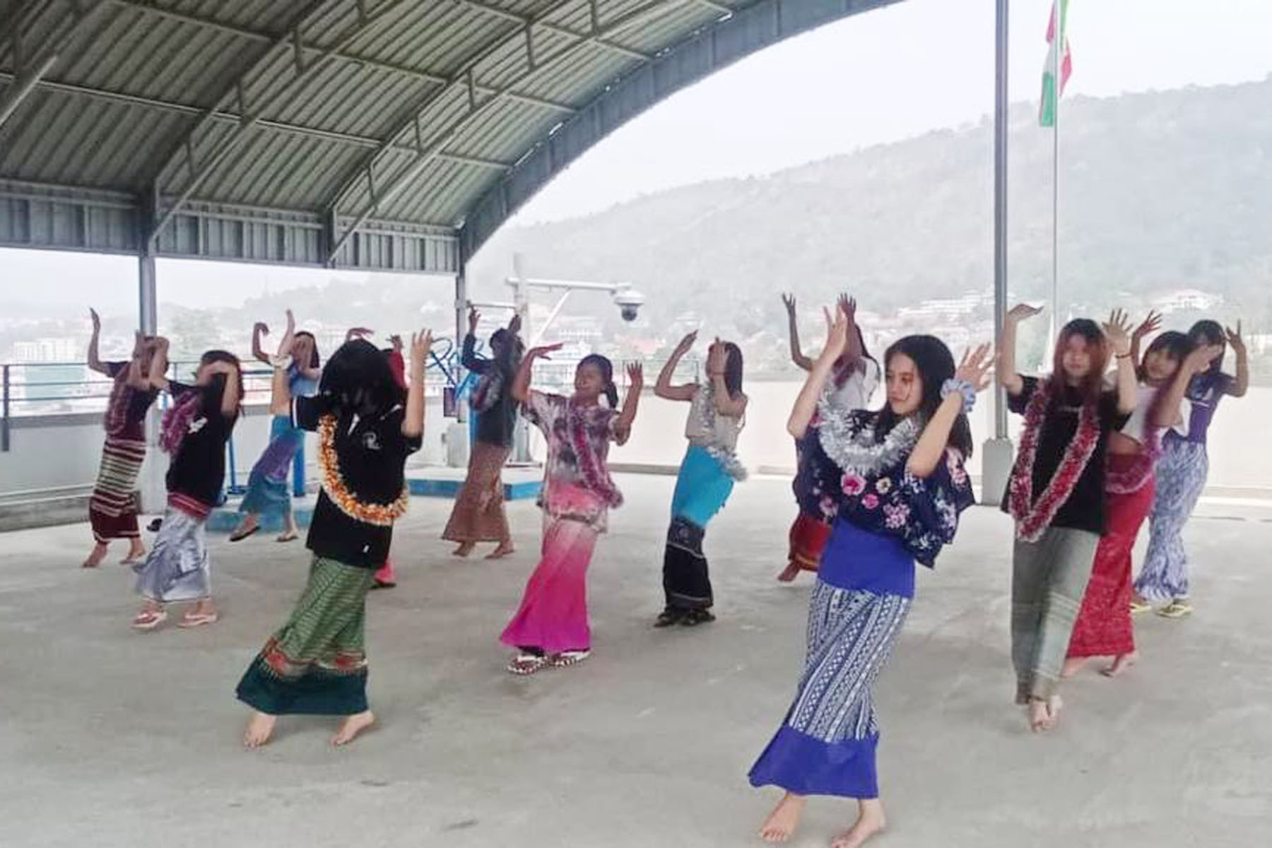 လူထုအခြေပြုဗဟိုဌာန (Community Centre Taunggyi)ရှိ အားကစားခန်းမတွင် ဆရာမဒေါ်ဟန်သီကိုအဖွဲ့၏ ၁၃၈၆ ခုနှစ် ၊ မဟာသင်္ကြန်ပွဲတော်အတွက် ယနေ့ညနေပိုင်းက ယိမ်းအကတိုက်နေသည့် မြင်ကွင်းများ။