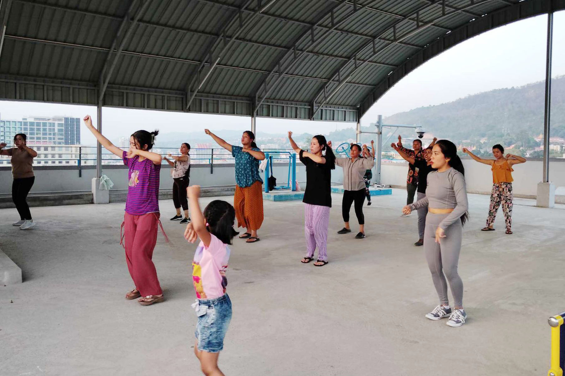 လူထုအခြေပြုဗဟိုဌာန (Community Centre Taunggyi)ရှိ ဟင်းလင်းပြင် လေ့ကျင့်ရေးအားကစားခန်းတွင် ဆရာမဒေါ်ပိုးသီရိခင် ဦးဆောင်သည့် Zumba Dances သင်တန်းသူများ၏ လှုပ်ရှားမှုမြင်ကွင်းများ။