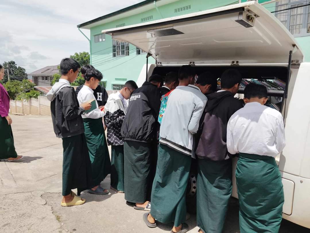 လူထုအခြေပြုဗဟိုဌာန (Community Centre Taunggyi)မှ ရွေ့လျားစာကြည့်တိုက် မော်တော်ယာဉ်ဖြင့် ယနေ့ နံနက်ပိုင်းက အထက(ထီသိမ်ရွေးတောင်)ကျောင်းတွင်စာအုပ်စာစောင်များ ငှါးရမ်းပေးမှု မှတ်တမ်း။