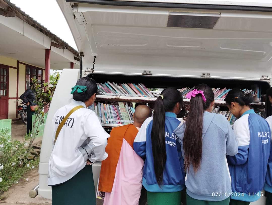 လူထုအခြေပြုဗဟိုဌာန (Community Centre Taunggyi)မှ ရွေ့လျားစာကြည့်တိုက် မော်တော်ယာဉ်ဖြင့် ယနေ့ နံနက်ပိုင်းက အလက(၇)ကျောင်းတွင်စာအုပ်စာစောင်များ ငှါးရမ်းပေးမှု မှတ်တမ်း။