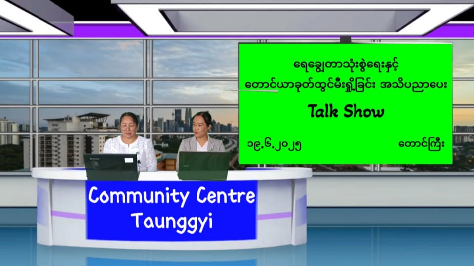ပြန်ကြားရေးနှင့်ပြည်သူ့ဆက်ဆံရေးဦးစီးဌာန၊ တောင်ကြီးခရိုင်နှင့် ပတ်ဝန်းကျင်ထိန်းသိမ်းရေးဦးစီးဌာနတို့ပူးပေါင်း၍ “ရေချွေတာသုံးစွဲရေးနှင့် တောင်ယာခုတ်ထွင်မီးရှို့ခြင်း”အသိပညာပေး Talk. Show ရိုက်ကူးထုတ်လွှင့်မှုမှတ်တမ်း