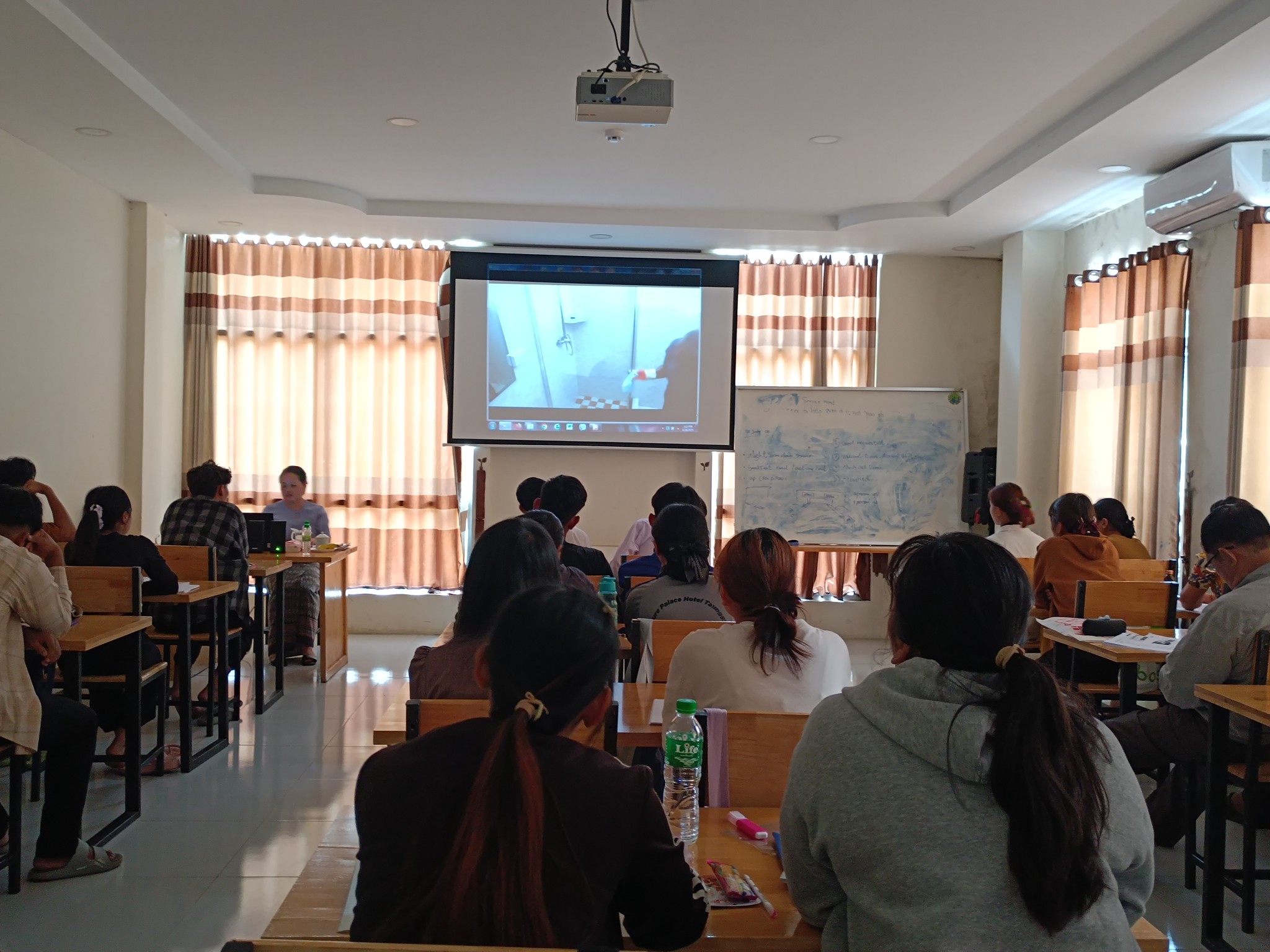 ပြန်ကြားရေးနှင့် ပြည်သူ့ဆက်ဆံရေးဦးစီးဌာန လူထုအခြေပြုဗဟိုဌာန( Community Centre Taunggyi) ဘက်စုံသုံးခန်းမ၌ ဟိုတယ်နှင့် ခရီးသွားလာရေးဝန်ကြီးဌာန၏ လမ်းညွှန်မူ ရှမ်းပြည်နယ်အစိုးရအဖွဲ့၏ ပံ့ပိုးကူညီမူတို့ဖြင့် အကောင်အထည်ဖော်ဆောင်ရွက်သည့် ဟိုတယ်ဆိုင်ရာဝန်ဆောင်မူသင်တန်း (၃)မျိုးမှ အိပ်ခန်းဆောင်ဘာသာရပ်သင်တန်း ဖွင့်လှစ်ဆောင်ရွက်နေမူမှတ်တမ်း