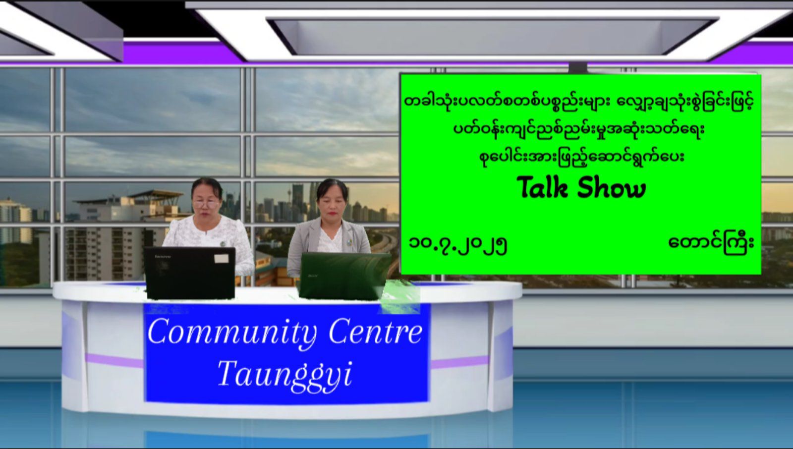 ပြန်ကြားရေးနှင့်ပြည်သူ့ဆက်ဆံရေးဦးစီးဌာန၊ တောင်ကြီးခရိုင်နှင့် ပတ်ဝန်းကျင်ထိန်းသိမ်းရေးဦးစီးဌာနတို့ပူးပေါင်း ၍ “တစ်ခါသုံးပလတ်စတစ်ပစ္စည်းများလျော့ချသုံးစွဲခြင်းဖြင့်ပတ်ဝန်းကျင်ညစ်ညမ်းမှုအဆုံးသတ်ရေး”အသိပညာပေး Talk Show ရိုက်ကူးထုတ်လွှင့်မှုမှတ်တမ်း