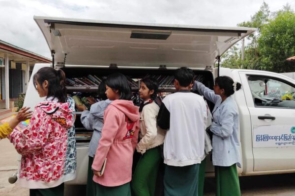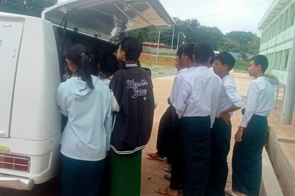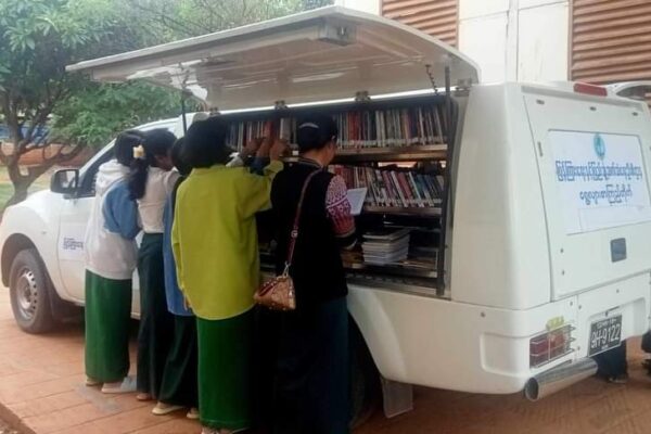 လူထုအခြေပြုဗဟိုဌာန (Community Centre Taunggyi)မှ ရွေ့လျားစာကြည့်တိုက် မော်တော်ယာဉ်ဖြင့် ယနေ့ နံနက်ပိုင်းက အထက(အေးသာယာ)ကျောင်းတွင်စာအုပ်စာစောင်များ ငှါးရမ်းပေးမှု မှတ်တမ်း။